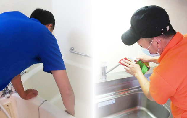 おそうじレスキューでは、経験豊富なプロのお掃除スタッフが専用の洗剤や道具・機材を使って、普段気が付かない箇所や手が届かない箇所、頑固な汚れや水垢、黒ずみ等、徹底的にすみずみまで丁寧にお掃除致します。